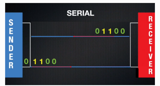 串口通信的英文缩写是UART(Universal Asynchronous Receiver Transmitter) 全称是通用异步收发器。听起来很高深的概念,其实就如下图,两个设备,一根线串起来,发送方在线的一头将数据转换为二进制序列,用高低电平按照顺序依次发送01信号,接收方在线的另一头读取这根信号线上的高低电平信号,对应转化为二进制的01序列。